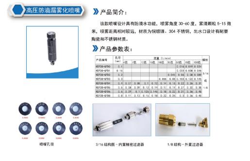 噴嘴選用:選用導(dǎo)流片式噴嘴,內(nèi)置精密過濾器,噴霧霧滴細小5-15um,工作壓力40-80公斤,流量60ml/min